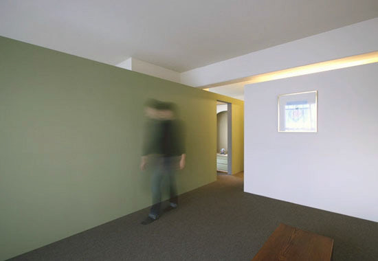 そして、壁と天井の間に「抜け」を設け、空気のかすかなつながり、天井の連続感を見せることで、空間のズレを操作しようと試みました。